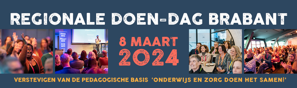 Op 8 maart 2024 organiseren we, in samenwerking met ‘Met Andere Ogen’, een regionale Doen-Dag in regio Brabant. In de regio’s West-Brabant en Tilburg hebben gemeenten, samenwerkingsverbanden Passend Onderwijs en jeugdhulp de handen ineen geslagen om, in samenwerking met ‘Met Andere Ogen’, aan de slag te gaan met de vraag hoe een ieder kan bijdragen aan het versterken van deze pedagogische basis.